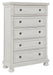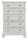 Elegant, timeless furnishings take your bedroom to the next level. Nothing does that better than this chest. The antiqued white finish with a wonderful grain texture radiates sophistication, while the dark bronze-tone hardware adds an ornate touch. A felt-lined top drawer rounds out the piece for the ultimate tasteful bedroom.