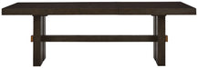 Dressed to thrill, this simply stunning dining table offers a high-design look at a down-to-earth price. Ultra sleek lines are accentuated with a dark waxy brown oak-tone finish that’s so easy on the eyes. Clean-lined and modern, the double pedestal base and thick edge tabletop showcase quality craftsmanship and attention to detail. Whether you're hosting family meals or holiday entertaining, it has a timeless look that’s made to last.