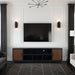 The Aria TV Stand Console boasts chic, modern, contemporary style. Exquisitely crafted from Poplar Solids and Okoume Veneers and Walnut Veneers, this Entertainment Center features clean, structural lines, a Two-Tone Black and Walnut finish, Black hardware and plinth base. Cable management openings on the back panel will keep all cords and wires concealed. Fully Assembled upon arrival, this piece is ready to unbox and enjoy.