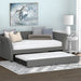 The Vienna daybed is a versatile addition to any space, whether it's a home office or a studio apartment. Its flared arms and gently curved back are upholstered in a gray woven fabric, offering a stylish look. By day, pile on the pillows to create the perfect lounging spot; by night, pull back the covers for a cozy bed. The convenient trundle pulls out effortlessly, serving as hidden storage with a divider bar or accommodating a second twin mattress for overnight guests. Enjoy the extra functionality and charm the Vienna daybed will bring to your home.