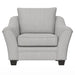 - The Casey chair steps up to the plate in cozy chenille fabric and understated flair. The classic contemporary frame is updated with flared arms accentuated by welting for a subtle saddle shape. Pillow-shaped back cushions blend the casual appeal of a scatterback with the tidiness of a more traditional box cushion. Upholstered in soft light gray with flecks of dark gray for added depth, this living room collection includes a sofa, loveseat, and chair, accompanied by an accent oval ottoman featuring hidden castors. Flip the top from cushioned upholstery to a dark wood tray to discover hidden storage. Complete the look by tossing on the included accent pillows in a blue and gray geometric print and a textured stripe in shades of navy to make every moment a home run in comfort.