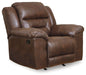 For those that love the cool look of leather but long for the warm feel of fabric, this rocker recliner delivers both with ease. Its high-performance padded faux leather is remarkably durable and easy to clean, just the thing for family spaces. Channel-stitched back cushions provide indulgent lumbar support for maximum comfort'not to mention fashion-forward flair.